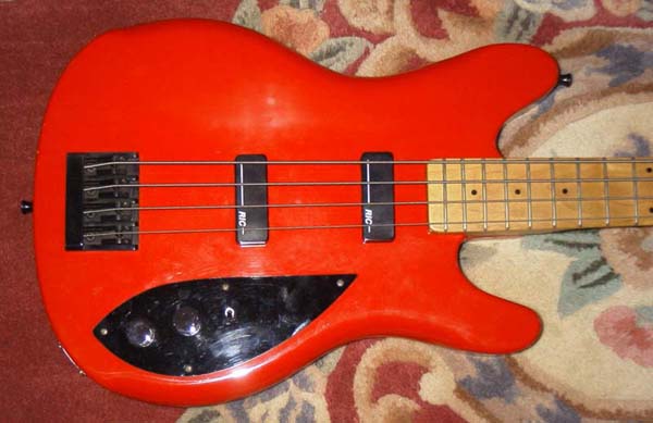 This is a somewhat rare bass. It is based on the 3001 body shape. It has the same neck and electronics as the 4004 bass. The neck and bridge are the same as the 4004 bass. The serial number is on the neck plate and on the jack plate. The pickups are pretty much the same as the 4004 humbuckers, except the height is controlled by rear loaded allen screws. I think it originally had a black truss rod cover / nameplate.